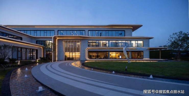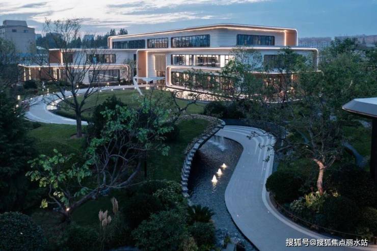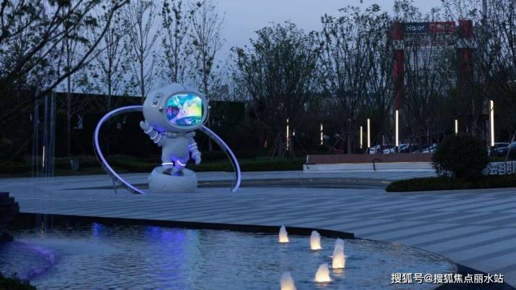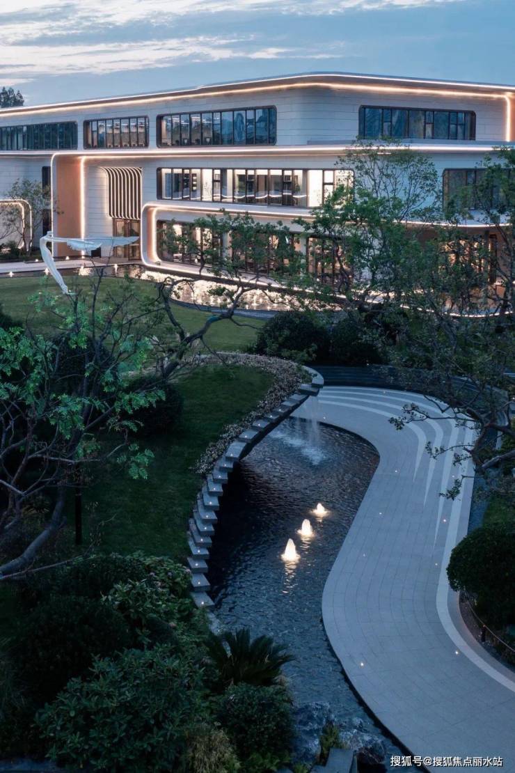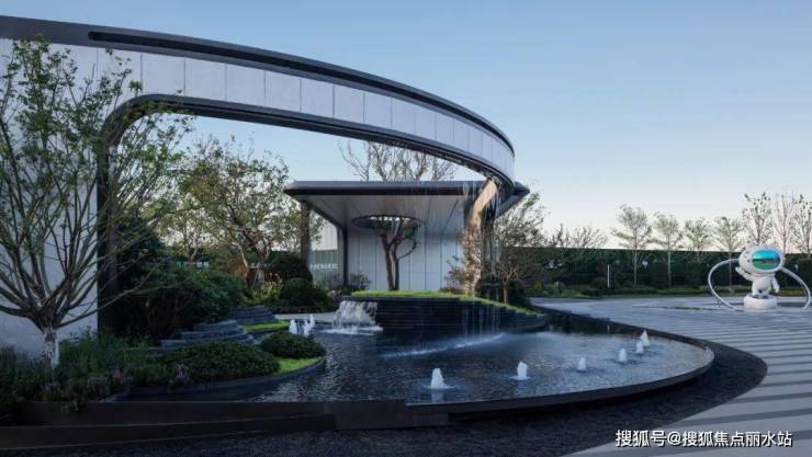 绕过高高的叠瀑,画面豁然开朗,建筑的全貌呈现出来,宽阔的草坪空间,伫立着一处展翅高飞的人物雕塑。涌泉伴随着脚步向售楼处延展,形成迎宾的序列感。