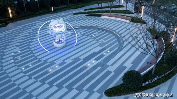 地面铺装通过黑灰的材质对比,营造出一圈圈如宇宙星轨般的旋转体验,从空中看下来,错落有致,像素般的拼接方式,规避石材的异形切割,使广场铺装更加规整有序的基础上,保证工期、节约成本。