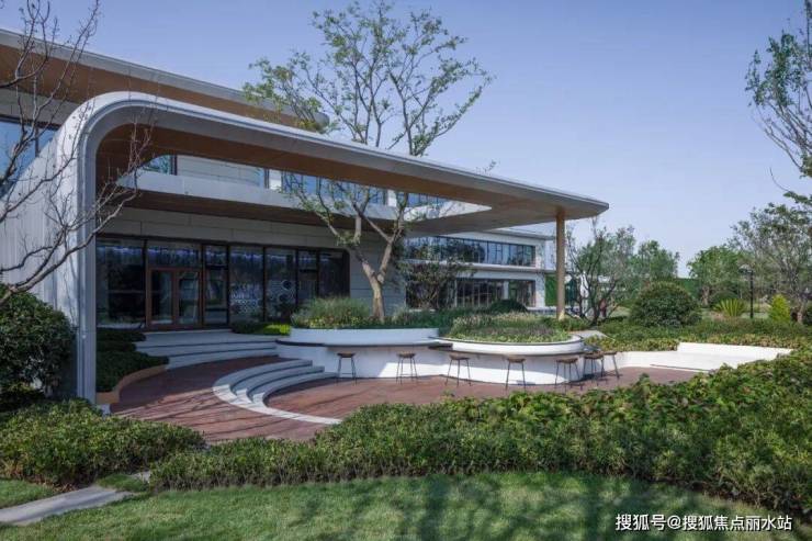 水景的末端在建筑前汇聚,形成聚拢的水湾,映衬着建筑,其间倒映着的天空与绿荫,轻松且惬意。