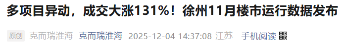 根据克而瑞数据,2025年11月,徐州市区商品住宅成交27.95万㎡,环比上涨131.08%,同比上涨87.42%!