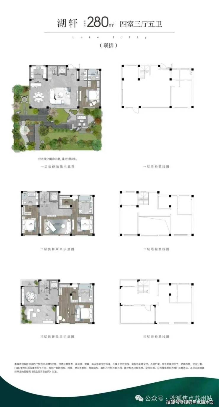 (1)联排:打造约246m²、约256m²(边户)、约280m²三个户型面积,以迭代的联排作品,致敬真别墅的回归