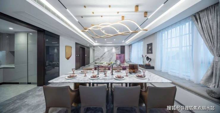 在彰显主人品味的餐客厅空间,地面由爱马仕灰大理石铺就,结合美观耐腐蚀的大理石踢脚线和大理石窗台台面,散发出低调奢雅的气质。