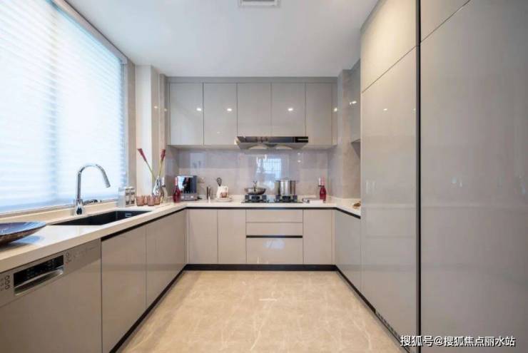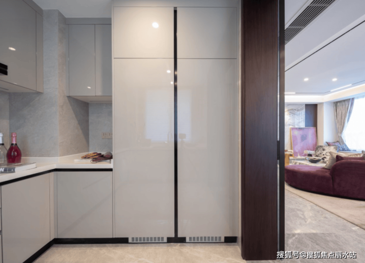 另外,在大量研究人们烹饪习惯的基础上,我们还将厨房分为收纳、储藏、预制、操作四大区域,天使拉篮、分类储物橱柜设计,并运用U型布局,让业主们能更轻松地烹饪美食。在厨房清洁方面,R型挡水条、厨房移门使用上轨道设计等等细节,来方便居者日常的打扫。