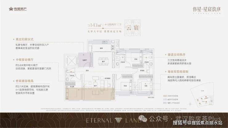 建面约143平,四房两卫,南向开间15.5米,市面上150㎡准四代,尺度只有13.75米。客厅开间5.8米,完全可以改造出一个小书房,可以当成4+x房来使用;子母门,独梯入户;厨房开窗面加大,南北完全通透,采光通风性更强;加了一间储藏室,使用上更方便。