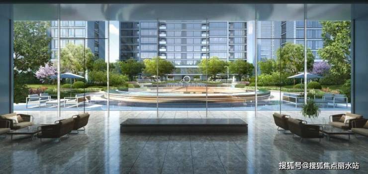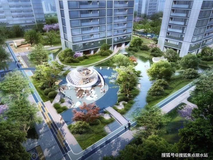 在景观规划上,永康绿城柳岸晓风项目在中轴景观布局了会所级下沉庭院及泳池绿境,强化中轴景观效果,串联业主生活组团。圆形下沉庭院,一层结合花镜及“指环雕塑水景”打造浪漫灵动的入口后花园,地下一层串联绿植、水景、雕塑,形成具有热带风情的下沉庭院。走出下沉庭院,入目所及就是泳池空间,使用跌水景分隔泳池区,使泳池区使用更加安全,两侧的大乔木设计使整个泳池区笼罩在绿意之中,给炎炎夏日下活动的人们送去清凉。