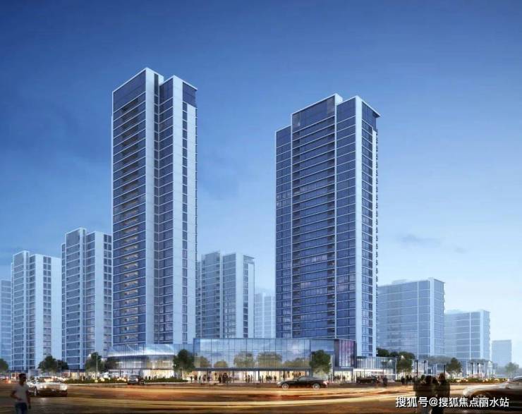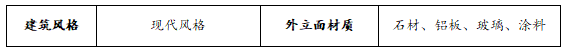 立面设计风格采用简洁典雅的现代风格。高层基座和裙房采用浅灰色干挂石材,主楼部分采用,铝板,铝饰面保温一体板,铝型材,玻璃和涂料。低多层商业配套采用浅灰色干挂石材,并结合铝板,铝型材,玻璃。窗体采用中透光 LOW-E 自然灰玻璃,金属灰氟碳漆喷涂铝合金窗框。立面形态上强调横向线条,建筑 形体舒展,横向通窗设计,让套内景观视线和采光条件更好。局部幕墙构造突显细节设计,形成简洁、 高雅而富有现代感的建筑形象。