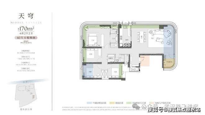 ③170㎡户型:四房两厅两卫,整个户型的布局与江面基本平行了,对比3号楼另外两个户型,170平户型的看江效果要优秀不少,客厅(270度观景)、主卧、主卫、厨房这几处空间都拥有不错的江景视野,观景面还是比较可观的。不过为了看江,这个户型的进深做的比较大,通透性稍显不足。