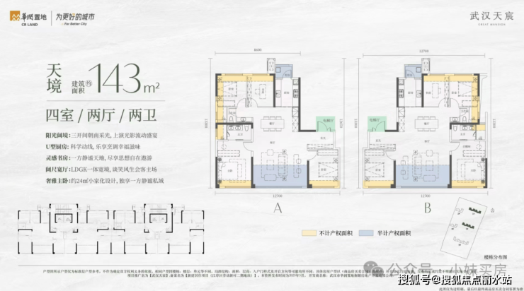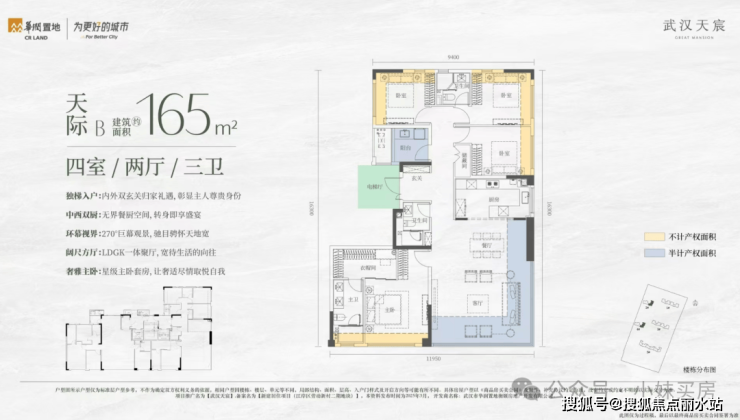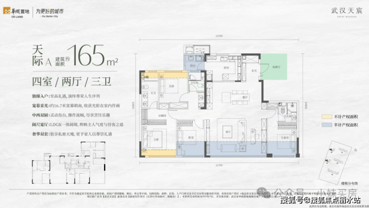 2、4号楼小高层就都是165平的户型了,也有两种布局。因为本身公摊更低,加上拓展面积,165平户型得房率可以达到约100%,标准的负公摊。
