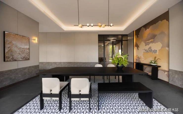 安哥拉黑石材铺就的抬地叠水,浮阶而上,又是铂金钻石材景墙大跨度张开怀抱。奢石用料十足,现代简约几何体块的气场也十足。