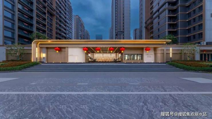 先说小区主入口,第五大道原来营销示范区展现的,是东侧沿绿轴公园面的入园大堂界面空间,酒店式环岛落客区,颜值在线: