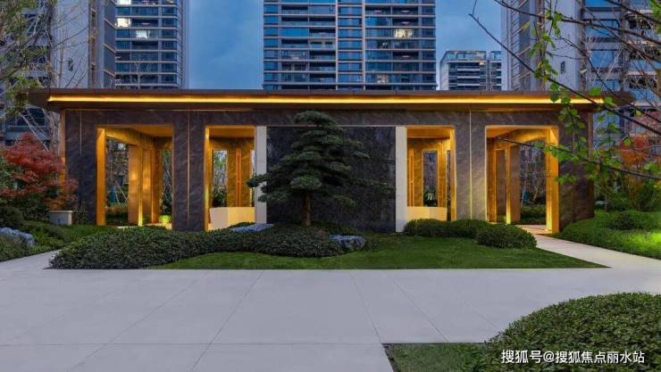 缓步过了景墙,居然又是镜面水系、圆润石材和孤植成景的大乔,构建了整片的森屿浮岛,营造日常归家动线静谧的场景氛围。