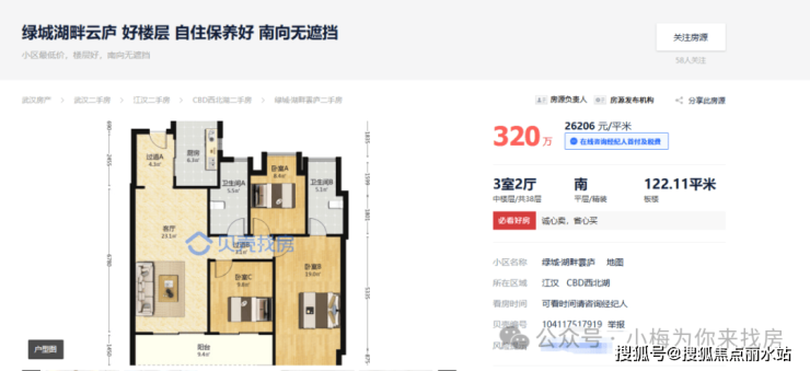 🏠面积122平方,挂牌320万(价格可谈)三房二厅二卫。这个房子是同户型性价比最高的,也是挂牌最便宜的。小区也有其它房源可以对比。居住预算在320万左右这个房子必看