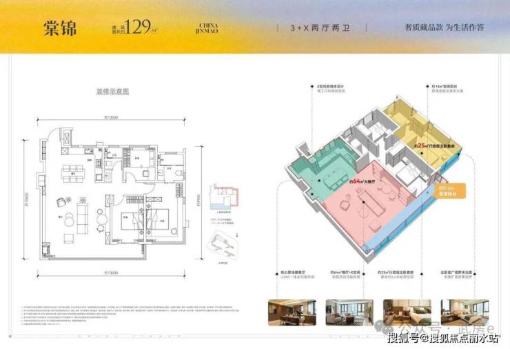 129㎡:南北双观湖,3+X房两厅两卫,63㎡LDKG设计,6.2米横厅,25㎡全景270°观湖主卧套房,9.2m跑步阳台链接次卧。