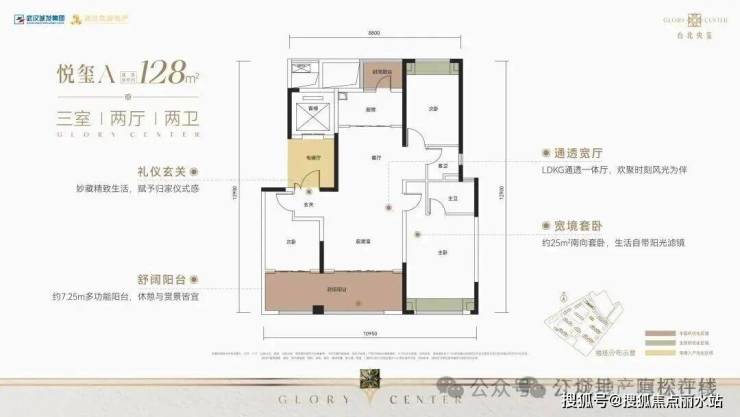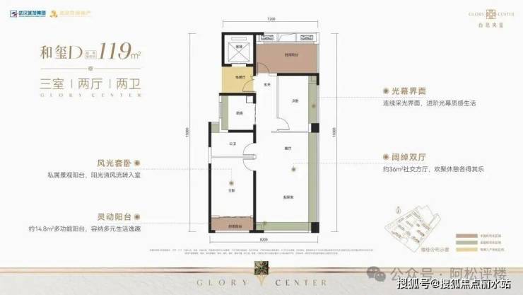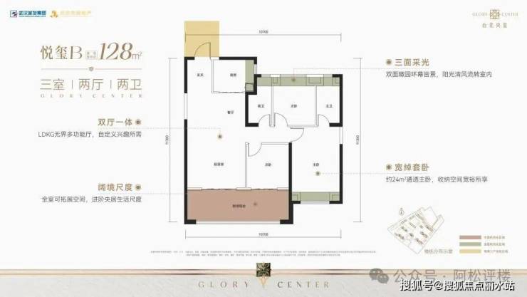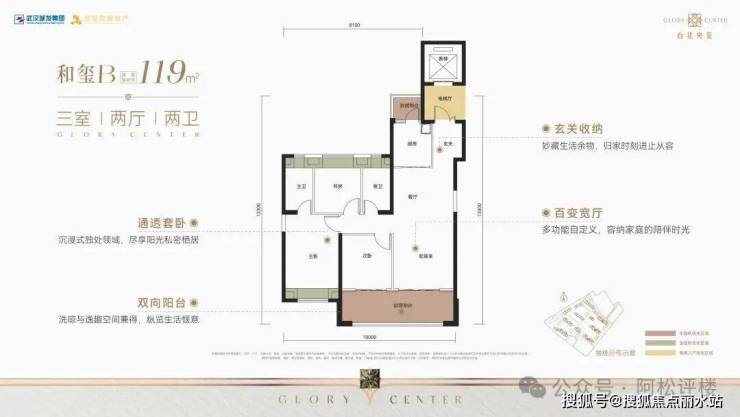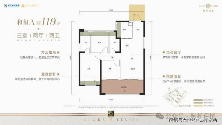该户型为9号楼单元连接处边户,南北通透,三开间朝南。该户型带独立电梯前室,南北双阳台,共2个飘窗,而且是“类三叶草”结构。