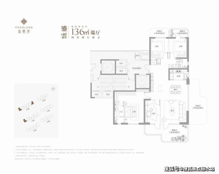 嵩雲序一共六栋住宅,三栋高层三栋洋房。从面积段来说,高层全部为约136平一个面积段,但是根据客厅位置不同,有136端厅和136方厅两个户型。