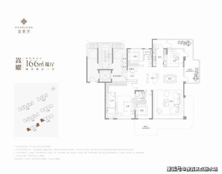 洋房也只是166一个面积段,同样根据客厅位置不同,有166端厅和166方厅两个户型。