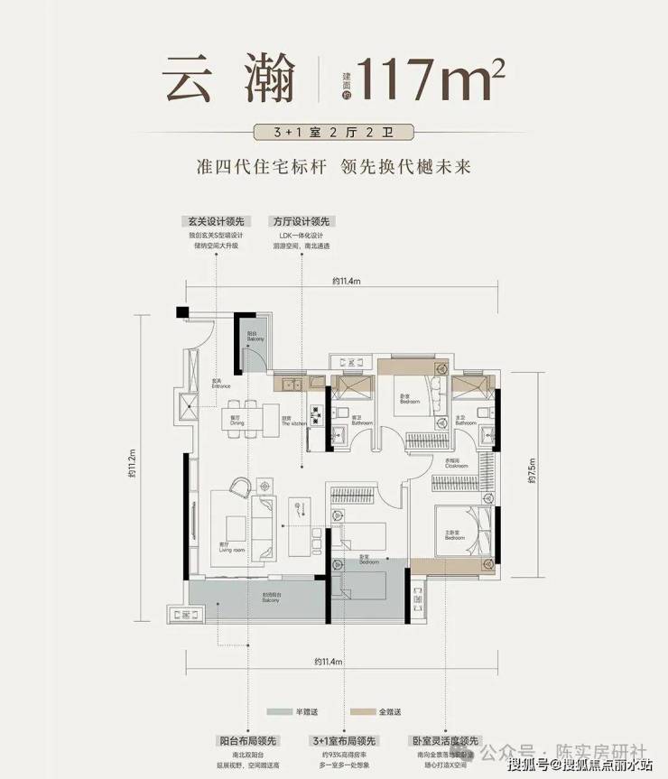 建面约117平3+1房两厅两卫:2号楼边户,南北通透,3.5开间朝南,比较方正。