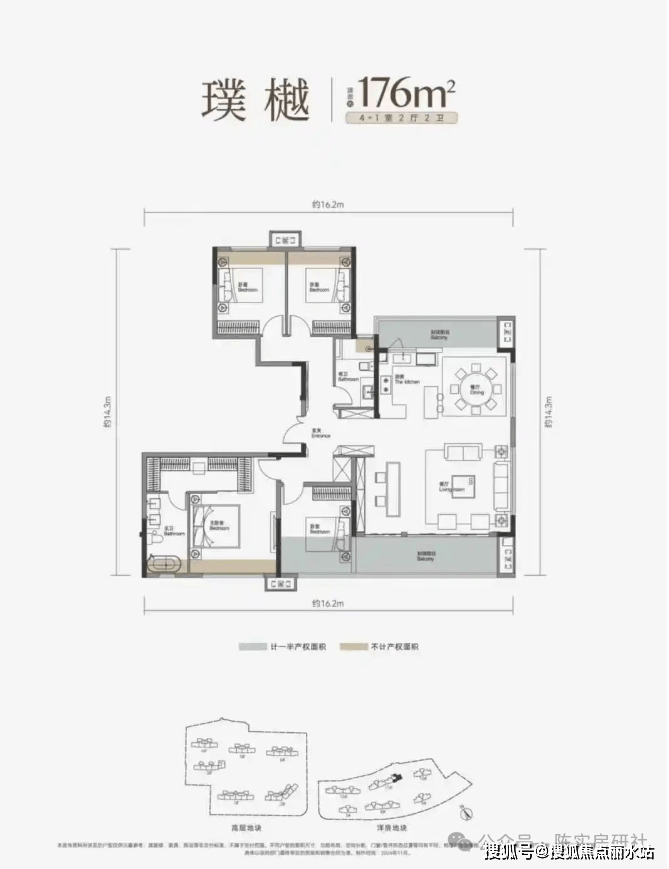 建面约176平4+1房两厅两卫:小高层户型,南北通透,四开间朝南且三面采光,动静分区,主卧及卫生间都是南向,舒适性更强;南北双阳台,这个户型整体结构还不错,甚至可以做五房,可惜只规划了两个卫生间,不及三卫实用。