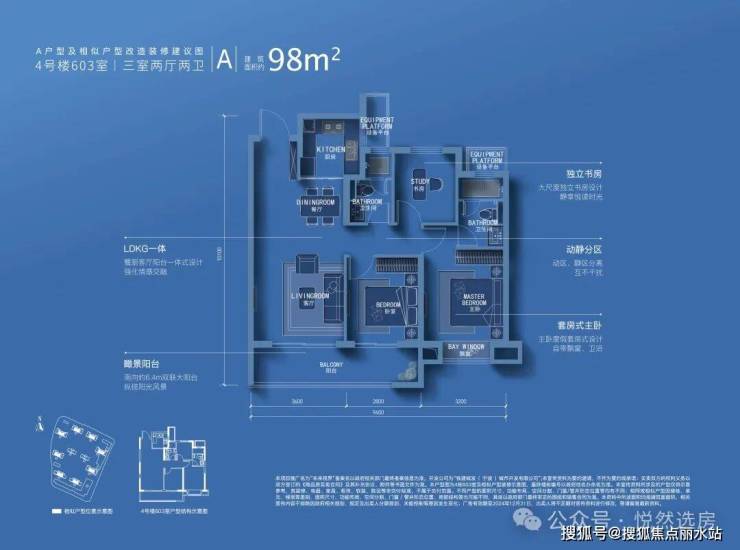 【产品解析】A户型|建面约98㎡ 三室两厅两卫独立书房:大尺度独立书房设计,静享悦读时光