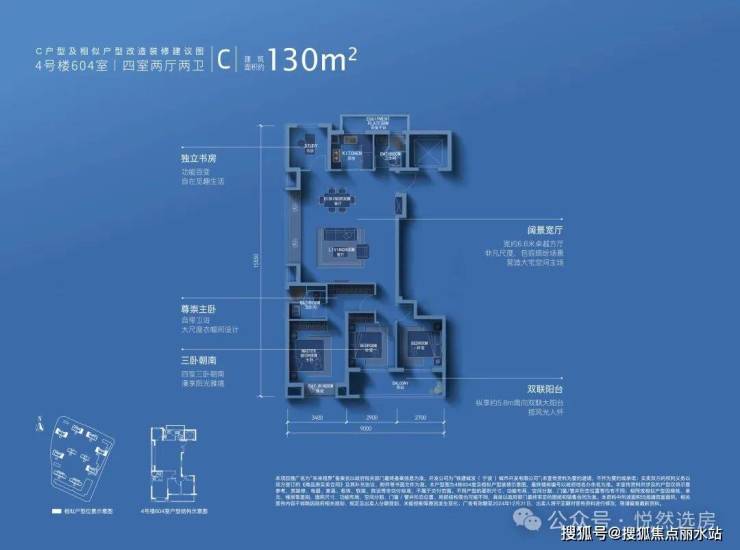 C户型|建面约130㎡ 四室两厅两卫独立书房:功能百变,自在觅趣生活
