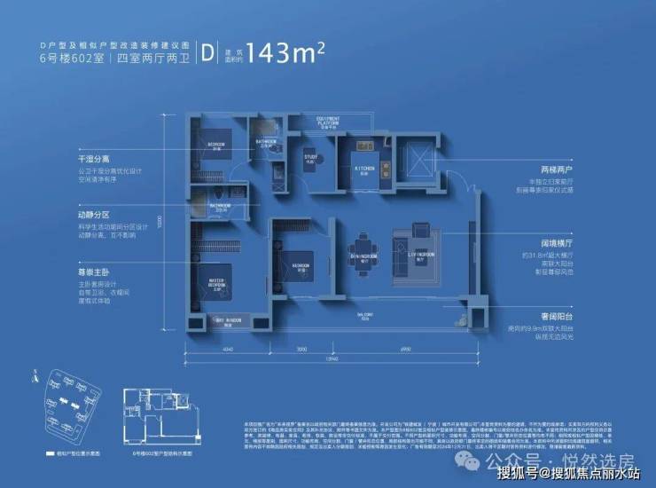 D户型|建面约143㎡四室两厅两卫干湿分离:公卫干湿分离优化设计,空间清净有序