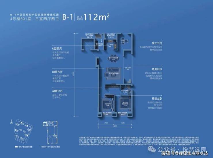 B-1户型|建面约112㎡ 三房两厅两卫独立书房:多功能书房空间独立设计,趣享百变生活