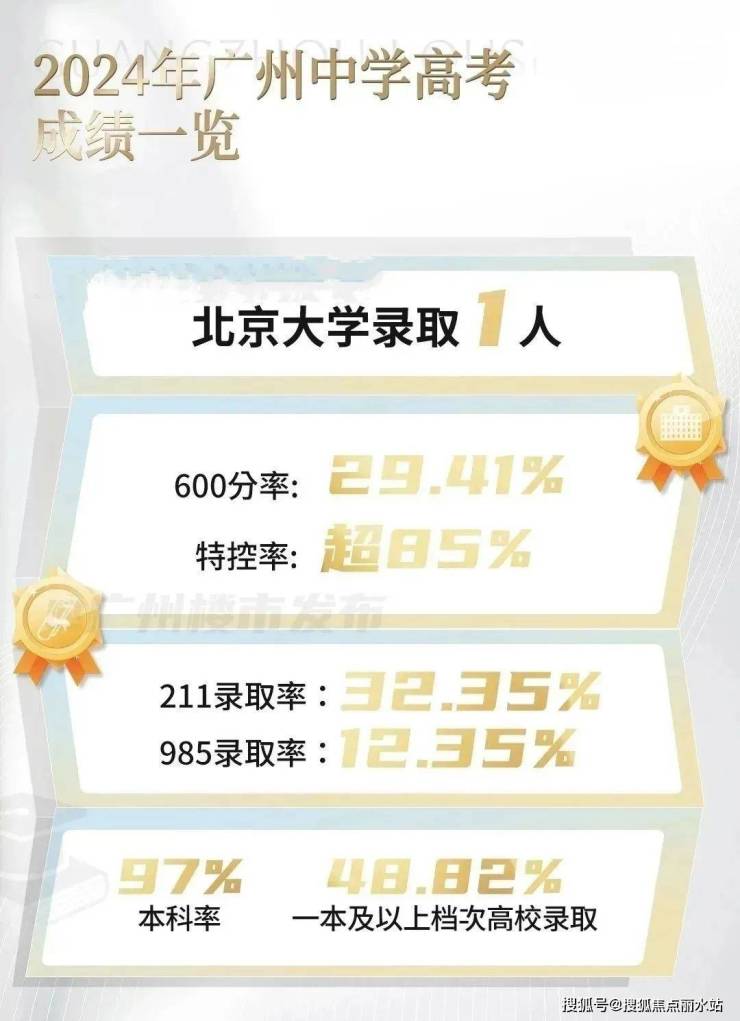 作为天河公办龙头学校,广州中学2024年本科率达97%,一本率48.82%,特空率超过85%,更是有1名同学被北京大学录取。