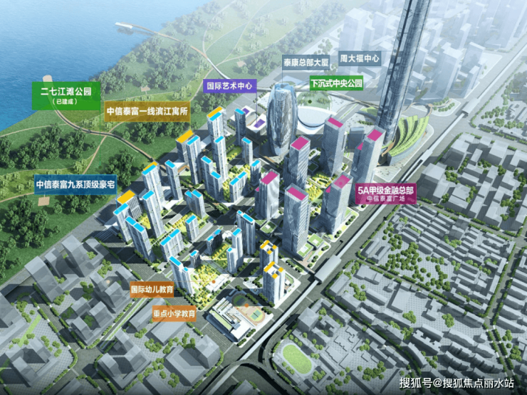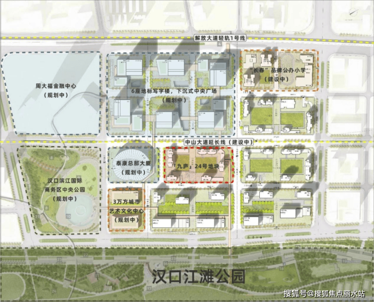 西面是中山大道延长线,挨着中信泰富滨江金融城的6栋地标写字楼,中间是下沉式中央广场,目前已陆续开工。