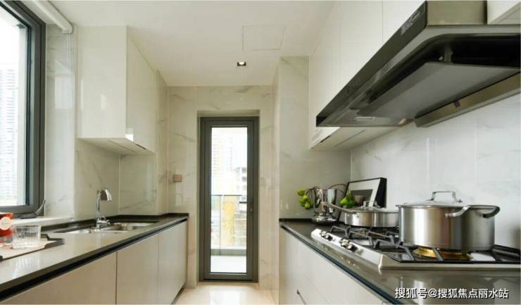厨房正对着大横厅,特设一面玻璃幕墙,显得客餐厅空间感开阔,也留有“小心机”。