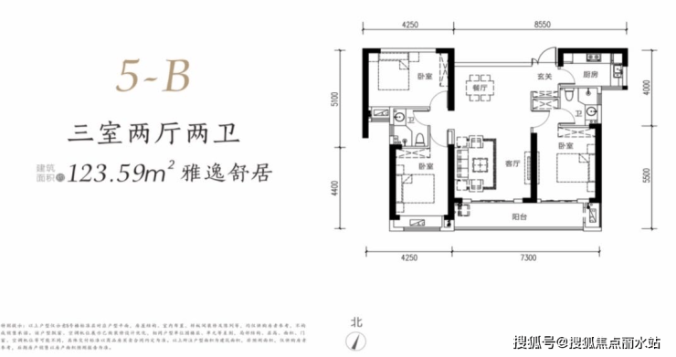 建面约123平户型三房两卫:5号楼中间户,全朝南,不通透,算是不太理想的户型。