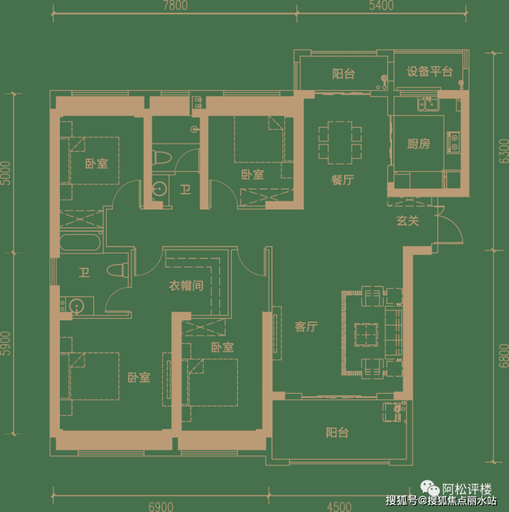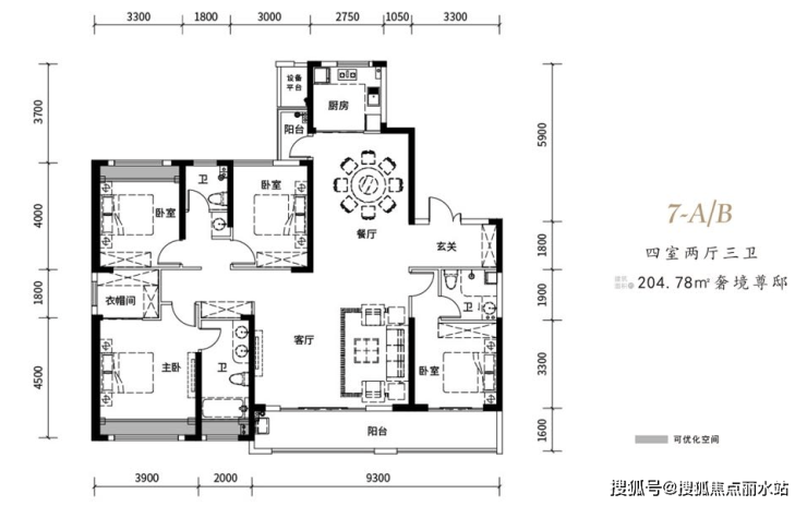 建面约204平户型四房两卫:7号楼边户,3.5开间朝南,南北通透,户型方正,南向大阳台,结构比较常规,在同等面积中算是没有太多想象力的户型。