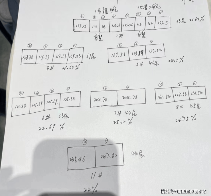 7号共44层,1个单元,2梯2户;5号楼44层,1个单元;8号楼45层,1个单元,2梯3户,包含建面约105-247平房源;