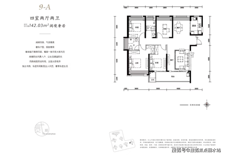 建面约142平户型四房两卫:9号楼边户,南北通透、三开间朝南且三面采光,属于三代户型中还不错的。