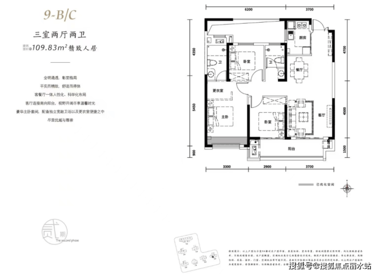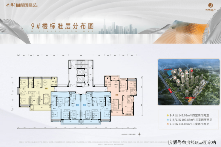 三期9号楼共45层,1个单元,2梯4户,共包含建面约109-143平房源。