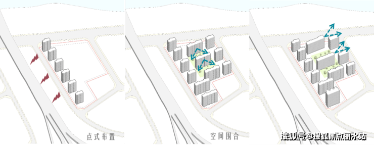 在规划布局上,项目采用板点结合、错位排布的空间结构;西侧点式布局减少沿街户数,最大程度上规避高速对小区的影响,中间板式布局延展横向空间,最大程度上围合大尺度中央景观庭院;规划整体错落有致,张弛有度的空间序列也提供了更好的观河观景视野。