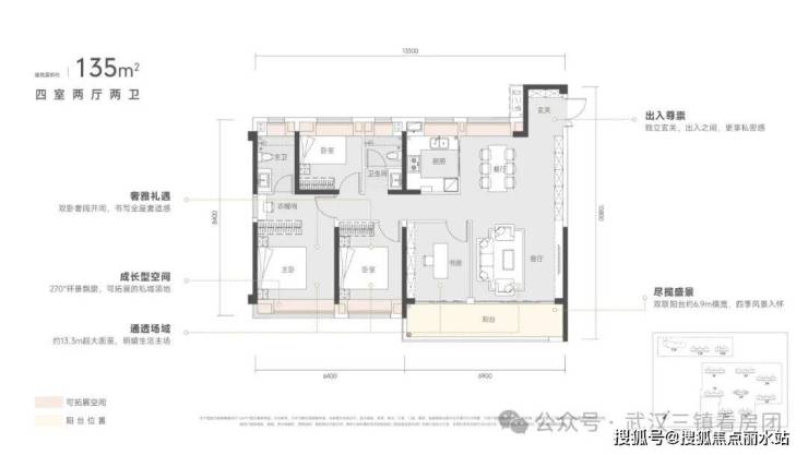 约13.3m南向四开间|约6.9米双联阳台|度假酒店级主卧
