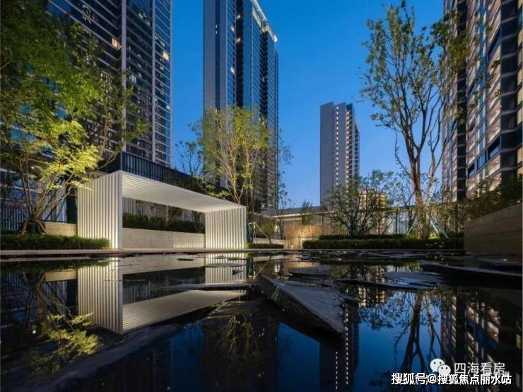 武汉首创的度假酒店风社区景观设计,打造兼具美感与实用性的现代园林景观,住宅社区入口镜面水景环绕,水庭院和中央水系形成核心景观