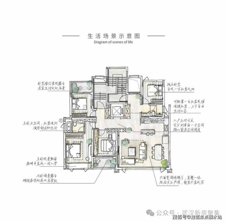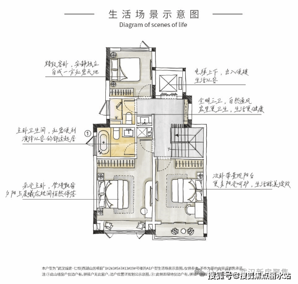 顺应山势,营造多台地景观布局,打造错落有致的组团空间,以“一环两轴十大功能空间”的格局,呈现自然景观最大化,融以现代审美及设计手法,营造真正属于武汉的山居别墅。