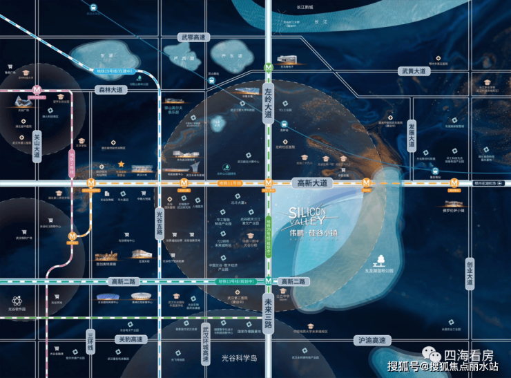 伟鹏硅谷小镇整体地块位于高新大道与未来三路交汇处,在楼市划分中属于左岭板块,行政划分属于东湖高新区,连接光谷中心城与葛店经济开发区。