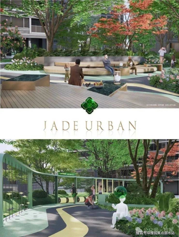 5)翡翠双园 超万方南北花园布朗式阳光草坡营造下楼便可露营的起伏草浪,南侧以“翡”之雅致,布局长者活动、春知学堂功能;北侧以“翠”之活力,规划乐活之环、儿童聚场等场地,实现自然与生活融合。