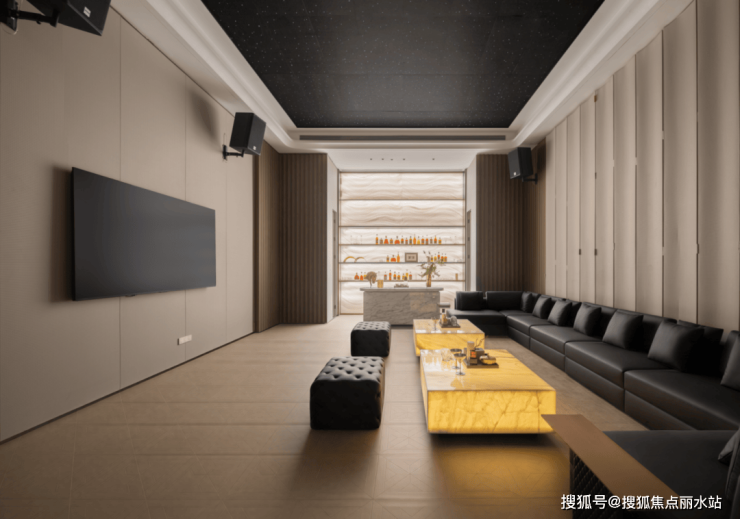 再往里,则是定制打造的星空顶影音厅,云石墙面透光,私享感与仪式感并存,无论在这里看电影还是唱歌,都会很有氛围。