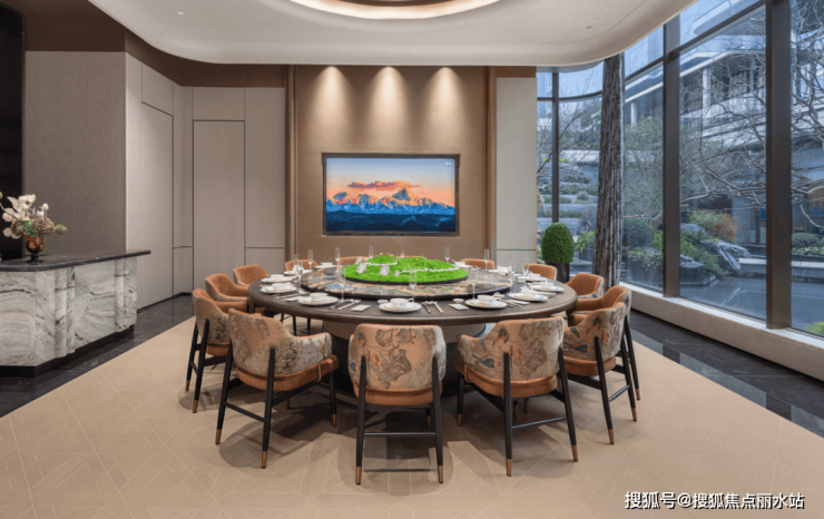 私宴厅两侧,分设茶室和棋牌室,并且都能通过大面积落地玻璃欣赏到庭院景色,用完餐在这里喝杯茶、或者打个牌,都会很惬意。