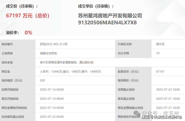 今年7月土拍中,苏州星鸿(星河&天鸿伟业)以总价约6.72亿竞得,成交楼面价14400元/㎡。