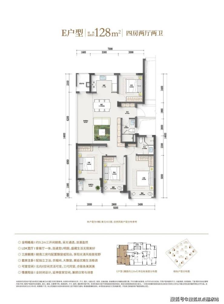 如果预算再多一点,家里人多一点,建面约128㎡边套四房户型,同样也是边厅户型,空间更大,功能性更强,总价相比市面上的139㎡还是亲民了许多。此外,作为板块首个封闭式阳台的住宅项目,还是之江首个全屋五重收纳功能柜子全赠送的项目。