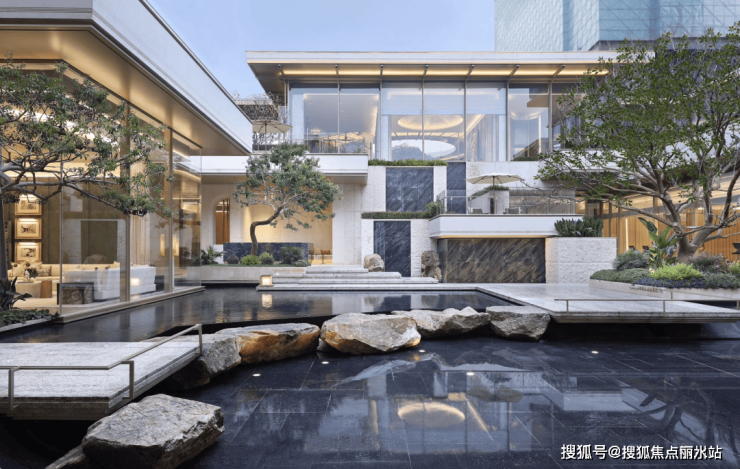 再往里走,一幅结合了中国山水画意境和现代感的景色画面映入眼帘,这是和萃揽悦园的下沉式庭院,也是业主们的“私享庭院”。