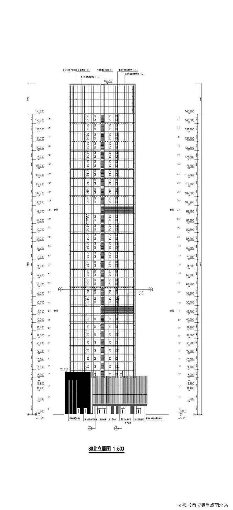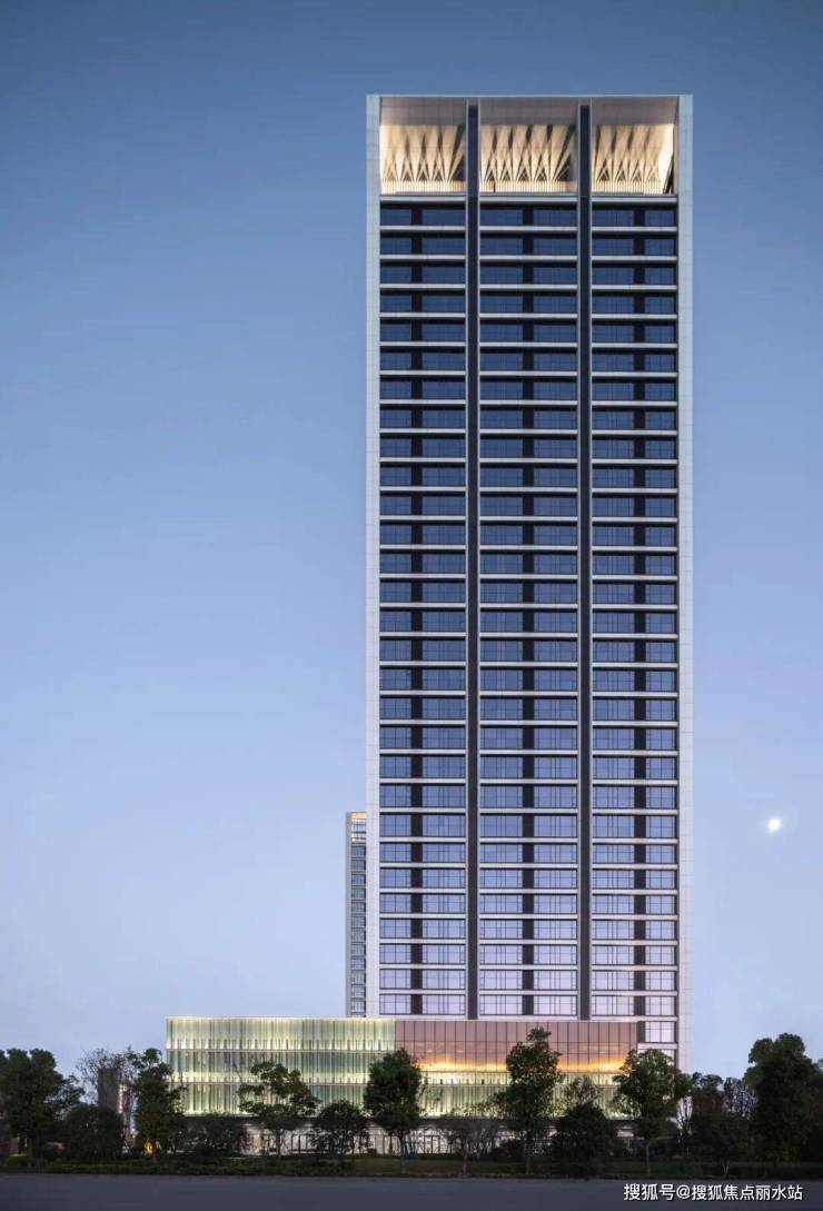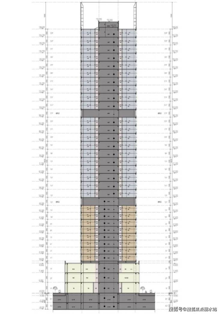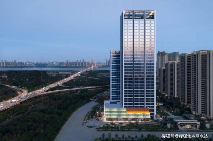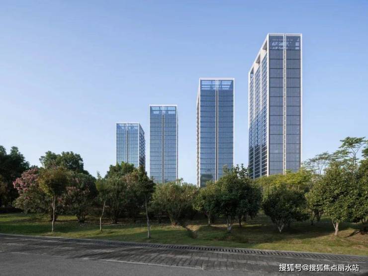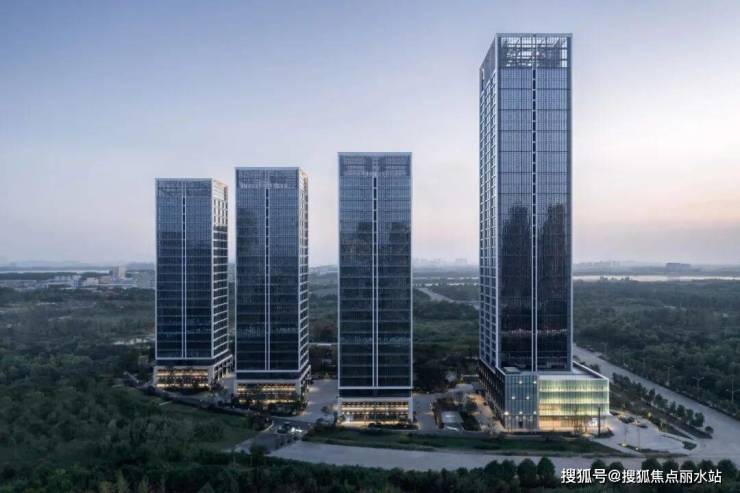 办公建筑朝向江面错位布局,提高景观面长度充分获取溢价。运用简洁有力的手法切分出竖向与横向肌理,大面积玻璃材质的运用,构筑了观景的通性透视野。