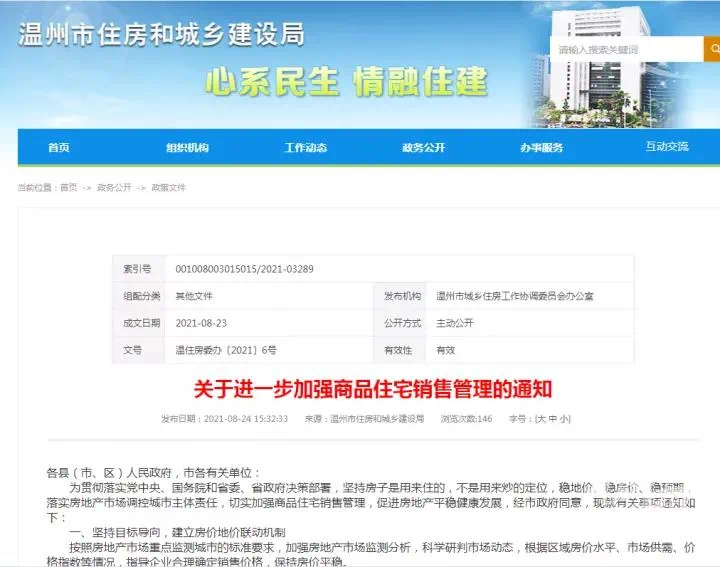 8月23日,温州宣布建立二手住房交易参考价格发布机制,对热点住宅小区二手住房交易价格进行监测。