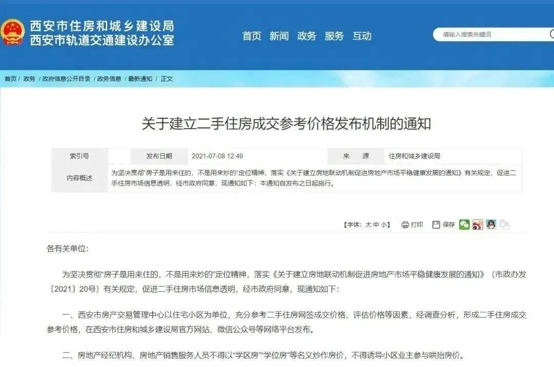 7月8日,西安市发布《关于建立二手住房成交参考价格发布机制的通知》,参考二手住房网签成交价格、评估价格等因素,形成二手住房成交参考价格。