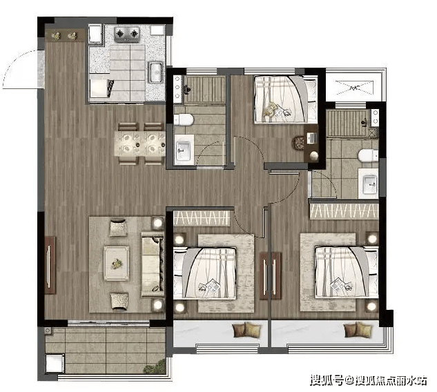 三室朝南、书房朝北,一室加客厅连体大阳台、两室带飘窗,采光无忧、南北通透,设计师根据苏州当地的日照情况,最大限度保障了每一户的日照时长。