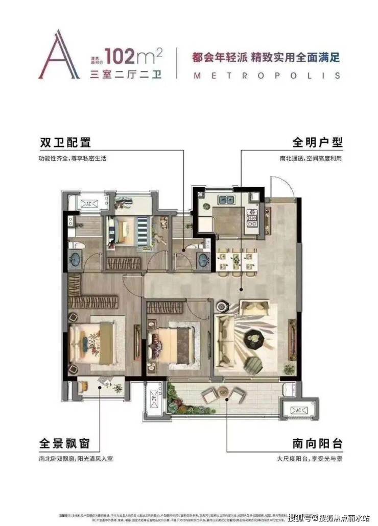 户型方正南北通透,三开间朝南的设计,采光条件较好,南北通透,通风条件极佳,双卫设计:两个卫生间既能极大的缓解早起抢洗漱间的尴尬,更能保障各家庭成员的隐私。